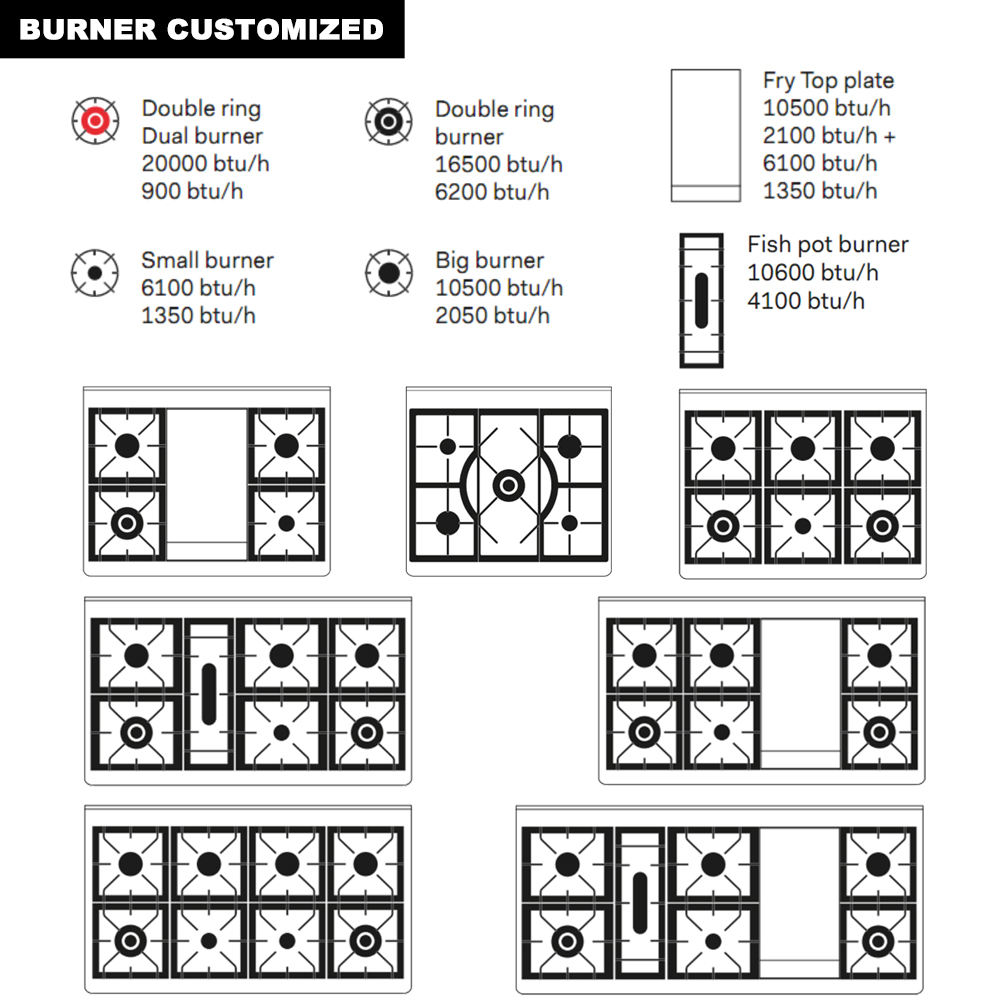 1. 오븐과 함께 6 버너 가스 스토브를 사용할 때는 사용 중에 안전을 보장하기 위해 관련 안전 작동 절차 및 예방 조치를 준수하십시오.